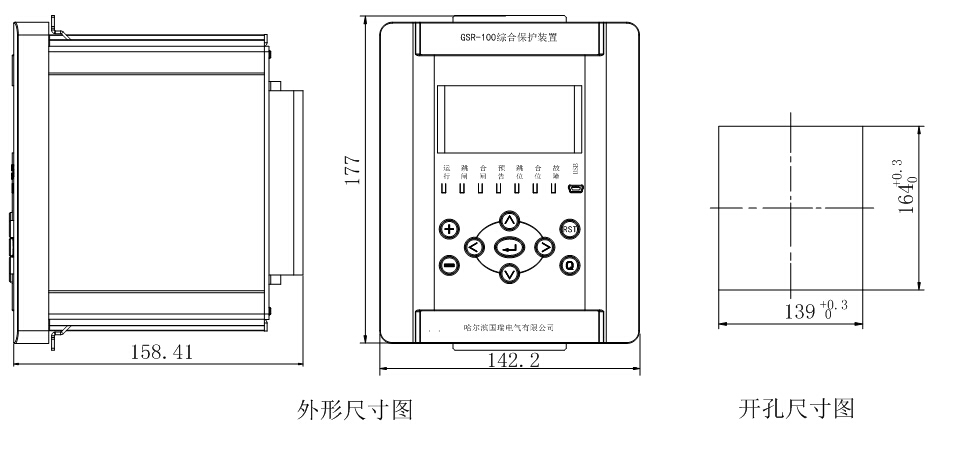 裝置采用小型全密閉機(jī)箱,機(jī)箱高度為 4U,寬度為19/3 英寸。機(jī)箱外形尺寸及開孔圖尺寸見圖 1。裝置采用背插式結(jié)構(gòu),整面板形式。前面板上包括大屏幕液晶、信號指示燈、操作按鍵及串行調(diào)試接口等。